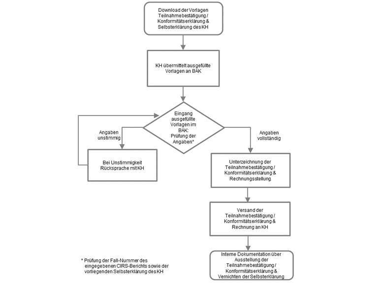 Die Bundesärztekammer (BÄK) stellt für Krankenhäuser Teilnahmebestätigungen / Konformitätserklärungen für die Teilnahme an CIRSmedical.de (www.cirsmedical.de) als üFMS gemäß der Anforderungen des G-BA aus. Dafür wird eine geringe Aufwandsentschädigung in Höhe von 70,00 € (inkl. der jeweils aktuell gültigen gesetzlichen USt.) erhoben.